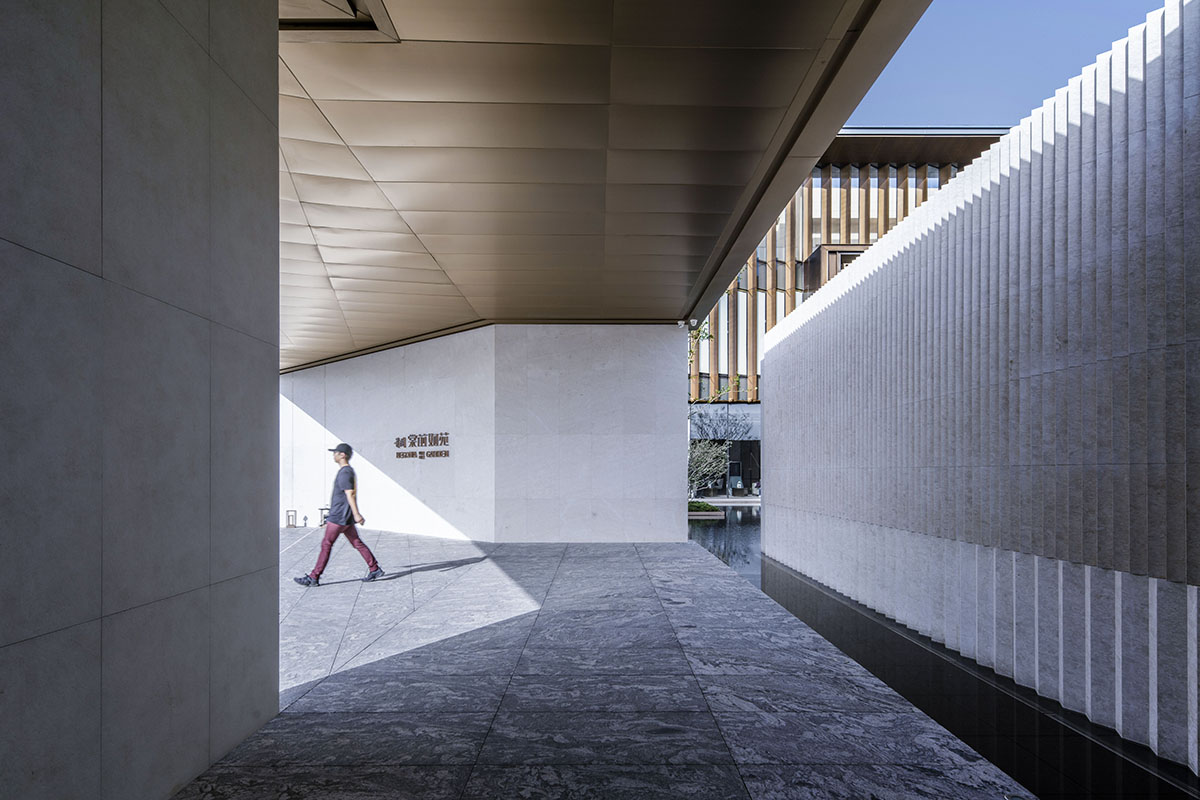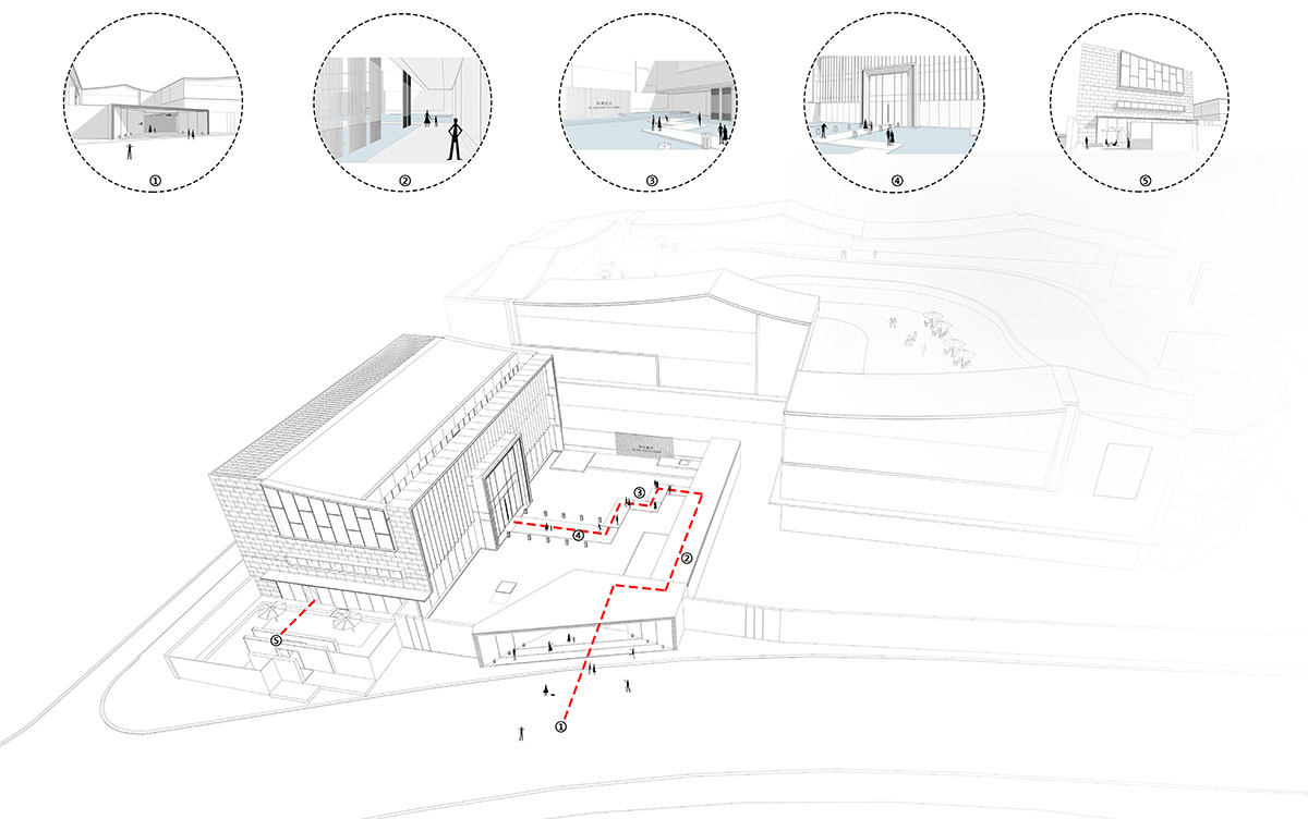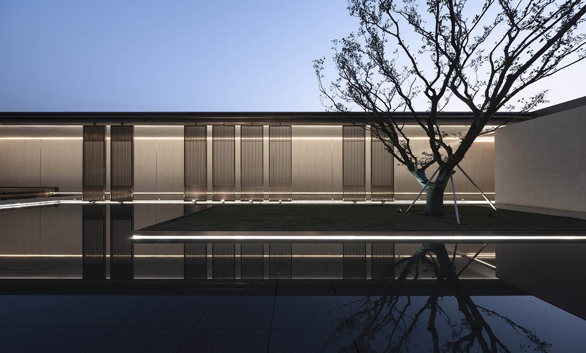 入口处影壁障景;转入连廊,透空格栅借景;汀步水院,抬头见景;进入建筑,落座观景;折入侧院,自成一景。五重空间曲折回环、以小见大,意在营造一种虚实相间的空间序列和缩微园林的意趣。