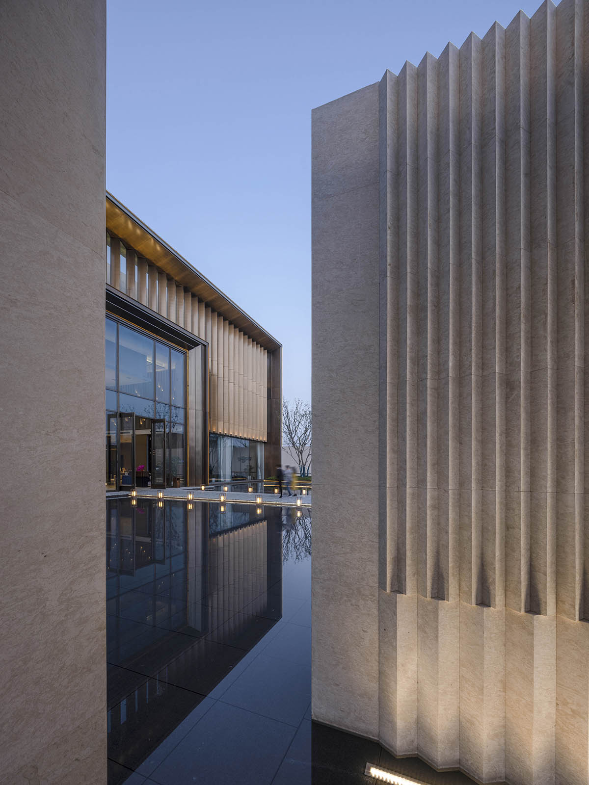 传统的苏州是清雅的,小桥流水人家;现代的苏州又是热烈的,准一线城市,年轻又时尚。苏州这座城市的精神特质是既传统又现代,既清雅又热烈。 在建筑立面的材质选择上,也着力体现这种双重性。建筑以浅米色温润石材为表皮,包裹内侧香槟色仿铜铝板,在轻与重、明与暗、淡雅与浓烈之间形成强烈的反差对比,建筑的张力由此彰显。