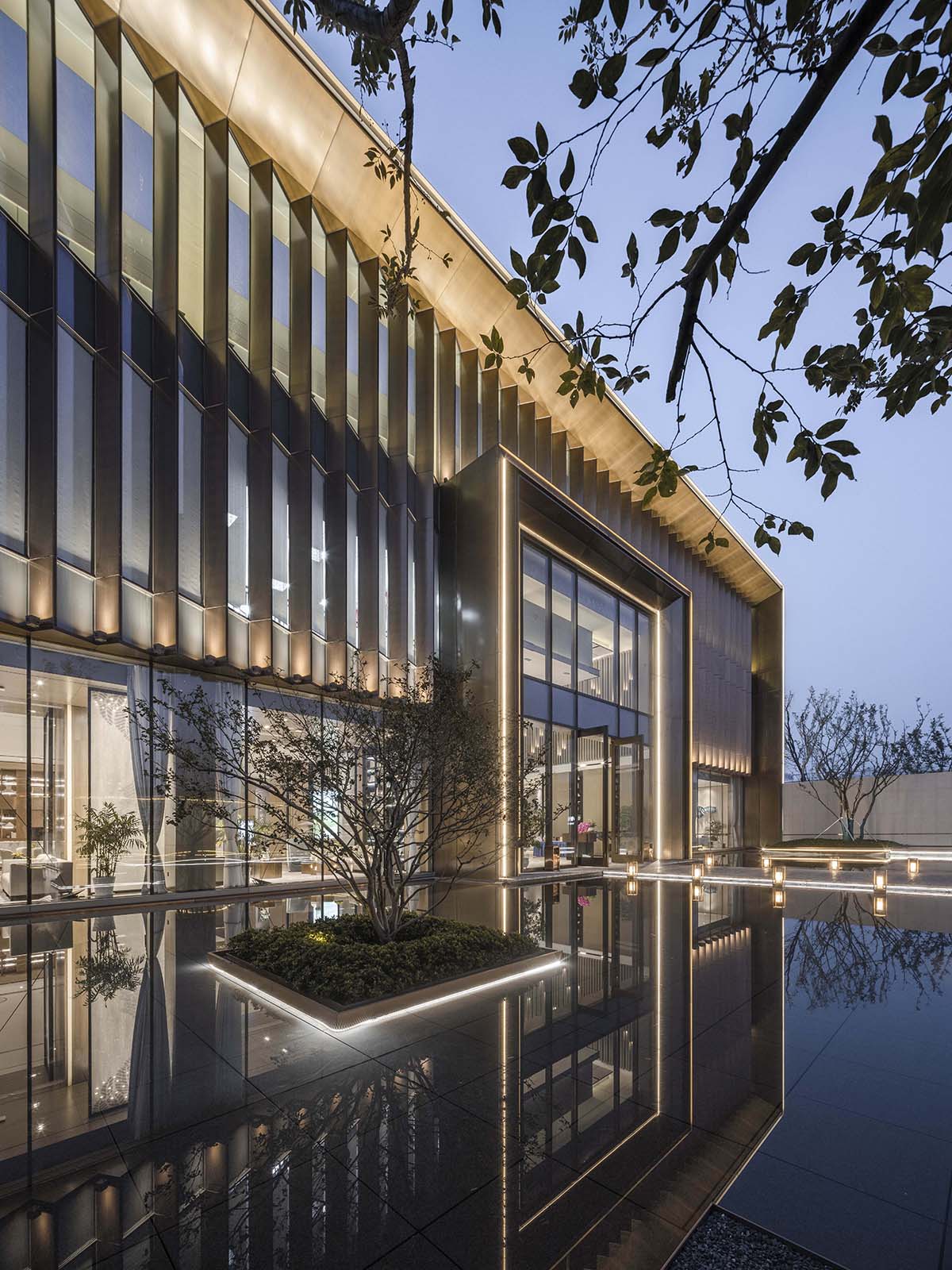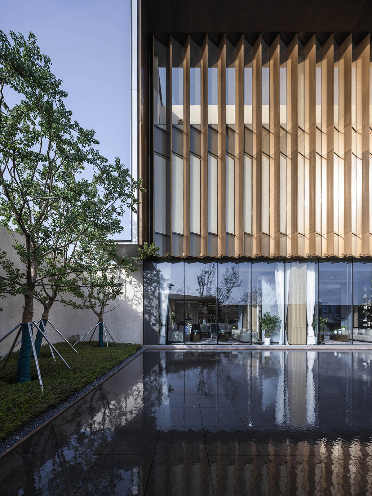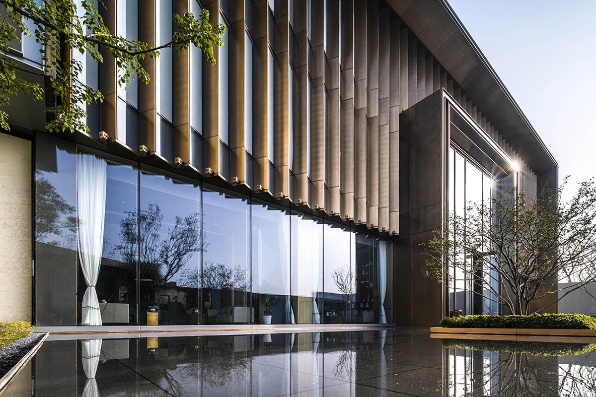 仿铜铝板与玻璃成折板组合,一侧硬朗,一侧通透,构成另一重反差对比。折板在建筑主立面上如一把折扇打开,形成明暗和色彩的韵律组合。建筑一层为展示大厅,二层为办公,三层为样板房,为保证样板房的自然采光通风,南侧做了局部露台。考虑到后期商业立面的整体性,露台南侧做了折板通高处理。