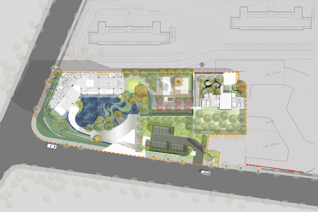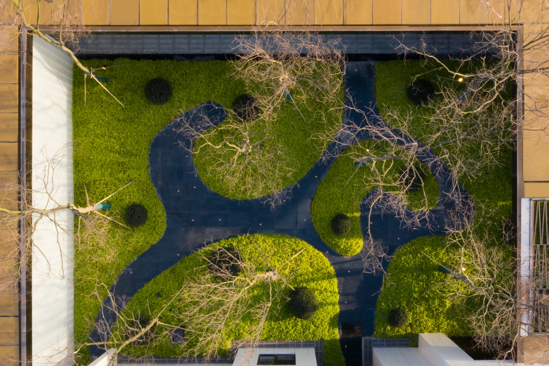融入传统围合造园手法来营造现代手法的表现,一步一看、一框一景、打造游走山林般的体验空间。从视觉、听觉、多层次,多维度打造流水,绿岛,植物。
