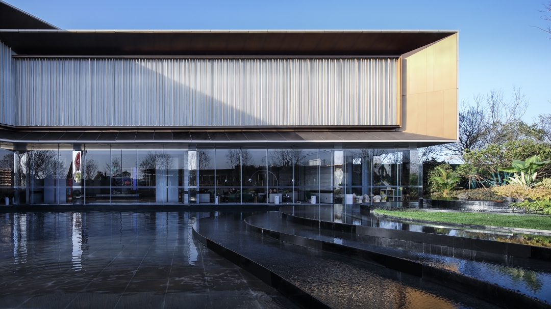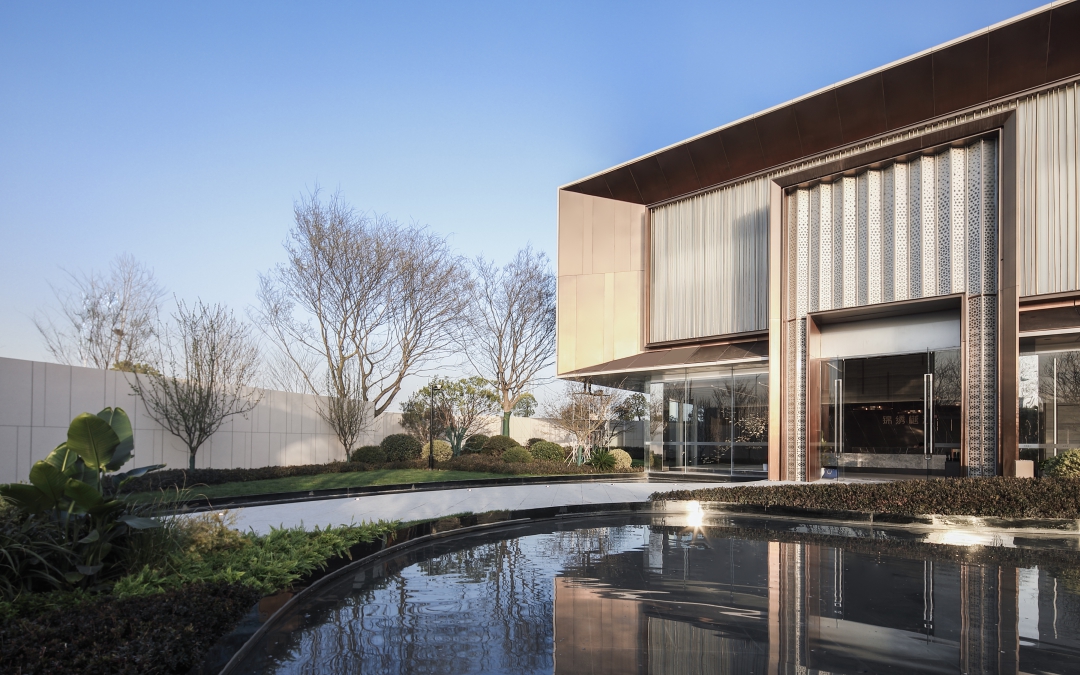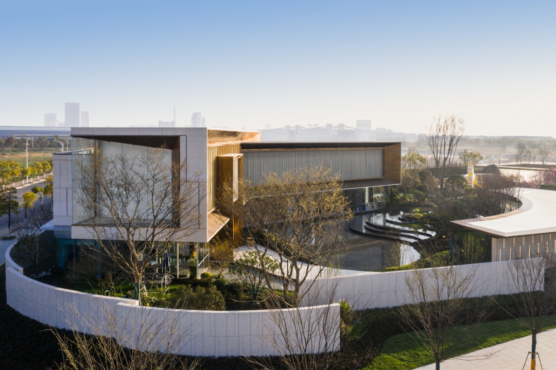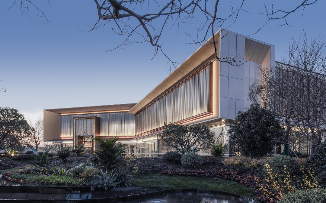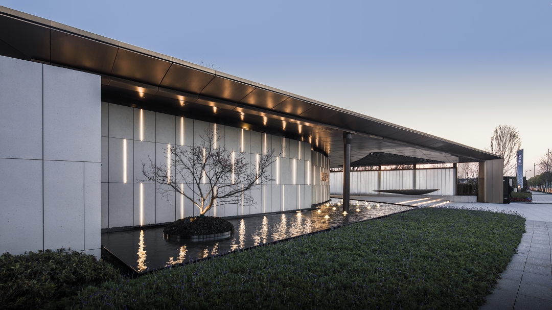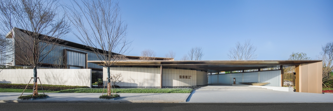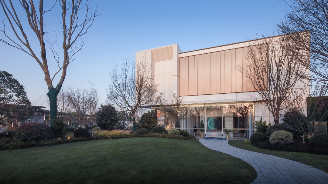 锦绣樾江府生活美学馆位于南京江北自贸区研新路与园特路交汇处,是社区配套商业街的一部分。在设计中将建筑与室外景观相互衬托,在唯美的人工空间中,引入一丝自然的环境美,营造一个有温度、会交流的生活美学馆。