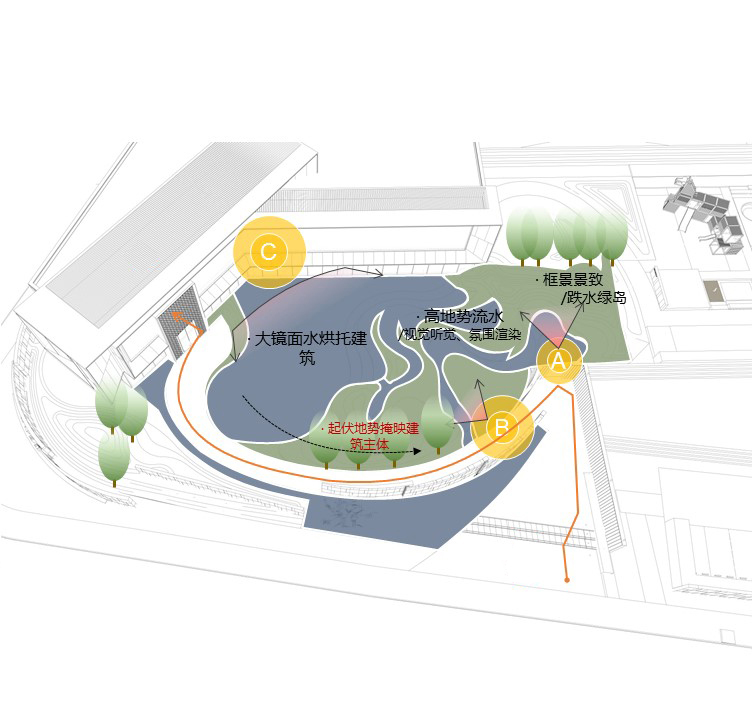 随后出现在眼前的是一条幽静林荫漫步道,两侧的跌水景观。以高地势流水为主体渲染气氛,起伏地势掩映建筑,动中有静。
