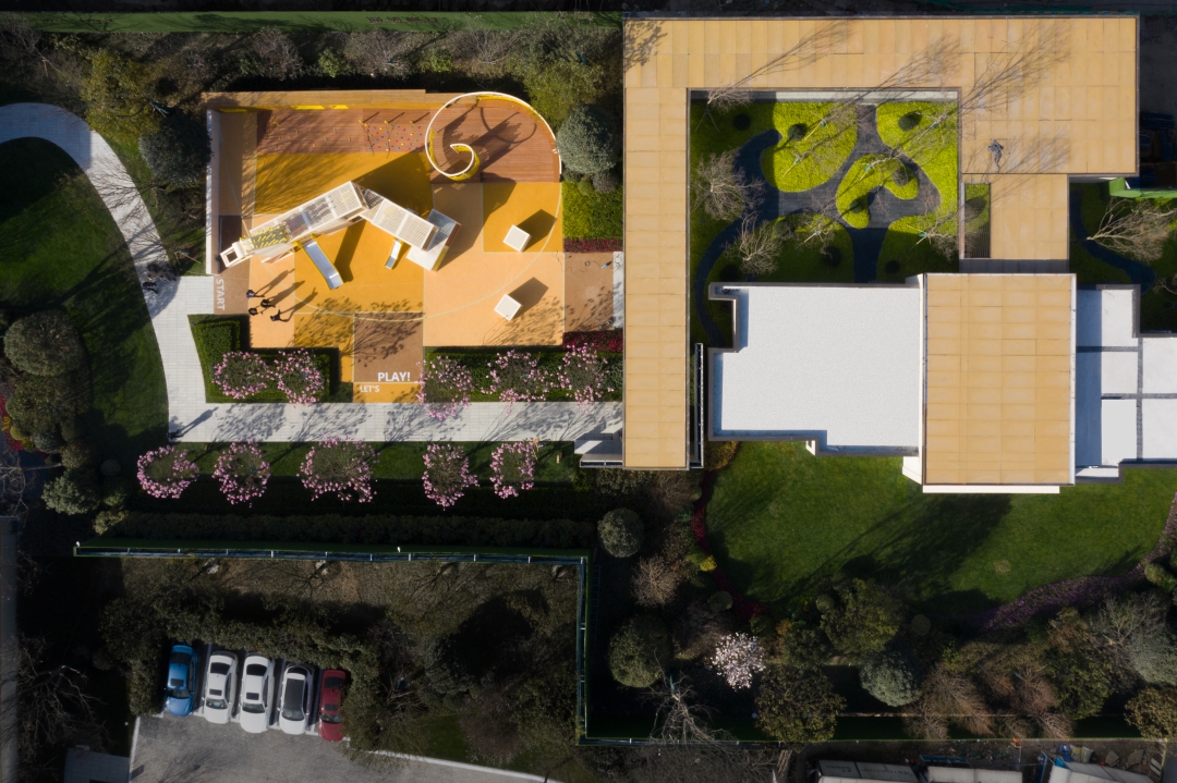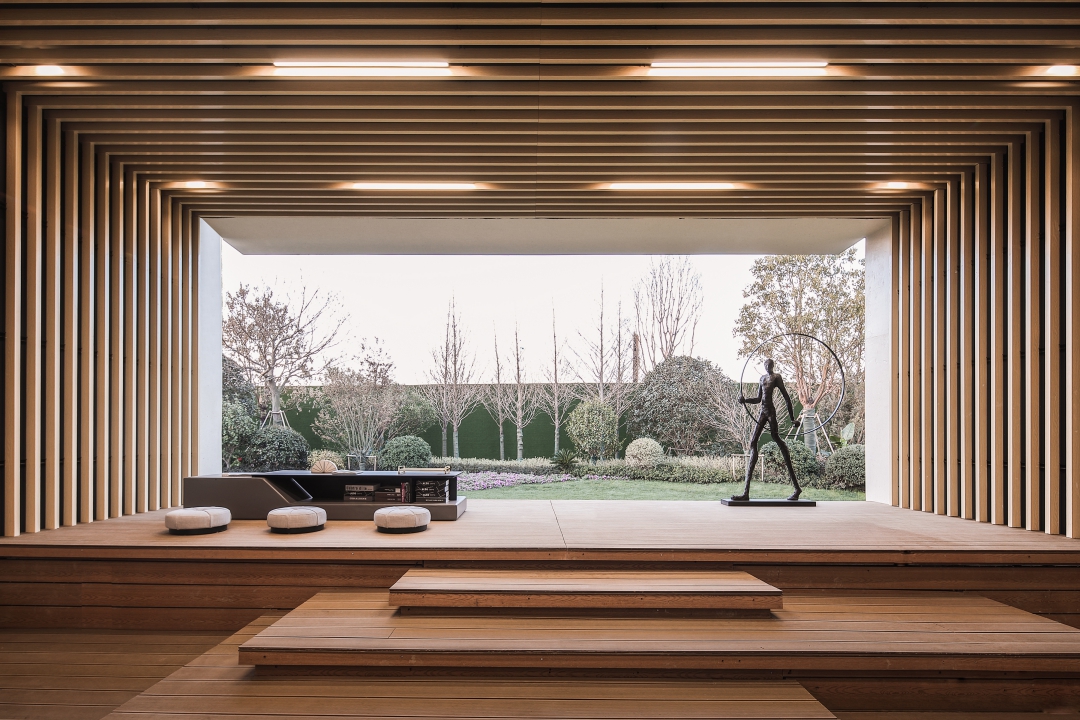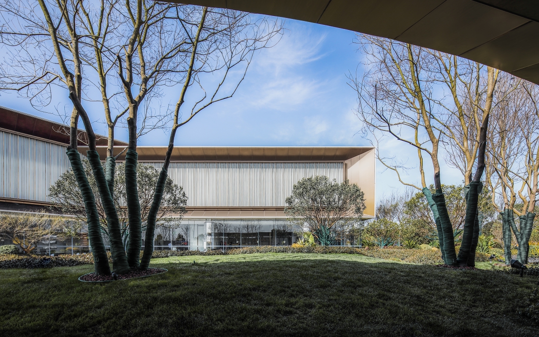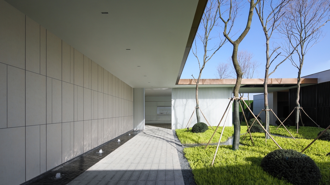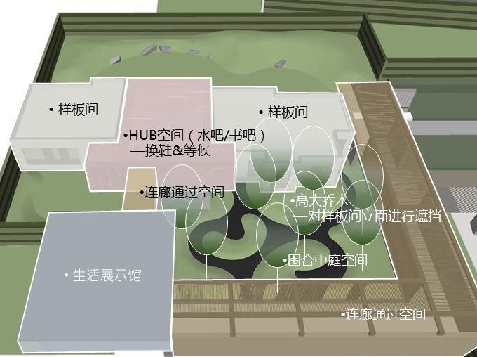 通过连廊围合出中庭空间,以动线首先穿过连廊,进入生活展示馆,再穿过一段廊架进入HUB空间,半围合式的布局在保持整体一体化的同时,也围合出多层次的隐密之所。换鞋&等待,可进入两边的样板间。