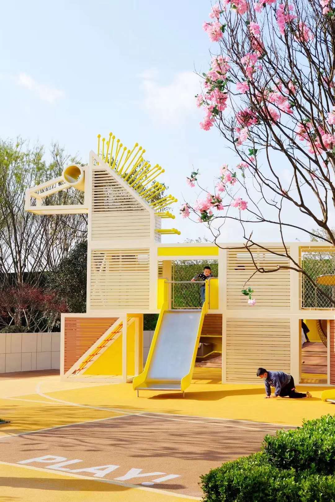 将动态的实物以静态的载体由美学的设计要素运用到乐园之中,让儿童直接徜徉在梦幻童话中,感受主题性童梦童享的魅力与生命力。开敞空间在游戏区域的围合边上均设置出口,强调空间的共享,使游戏区域与周围环境相互融合,相互渗透。