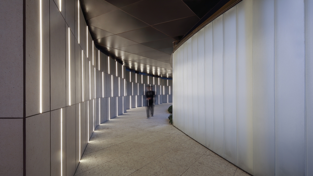 建筑表皮面板用12mm厚超白钢化玻璃,夹胶玻璃肋支撑;2mm不锈钢拉丝仿铜;260宽8mm厚双层U型玻璃正反扣,上下槽式连接,将葡萄牙米黄石材镶嵌其中。这些材料进行组合与构造,以材料及构造手法保证平整度,建筑表皮细节上的使用确保了肌理的辨识度。