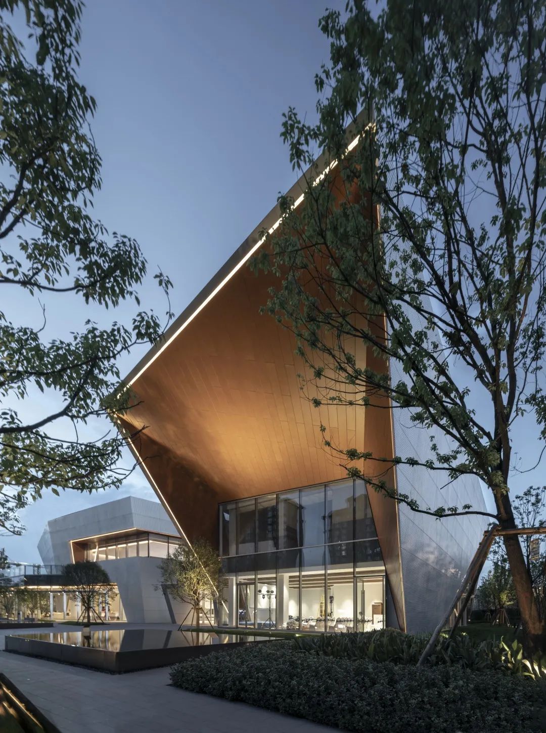 为了在夜晚照亮周界与广场,将建筑通透的玻璃面置于一层,实体的金属面置于二层,激活了内外部的行人体验。立面上仅使用3种建筑材料,纯净表皮最大化展示形态美。