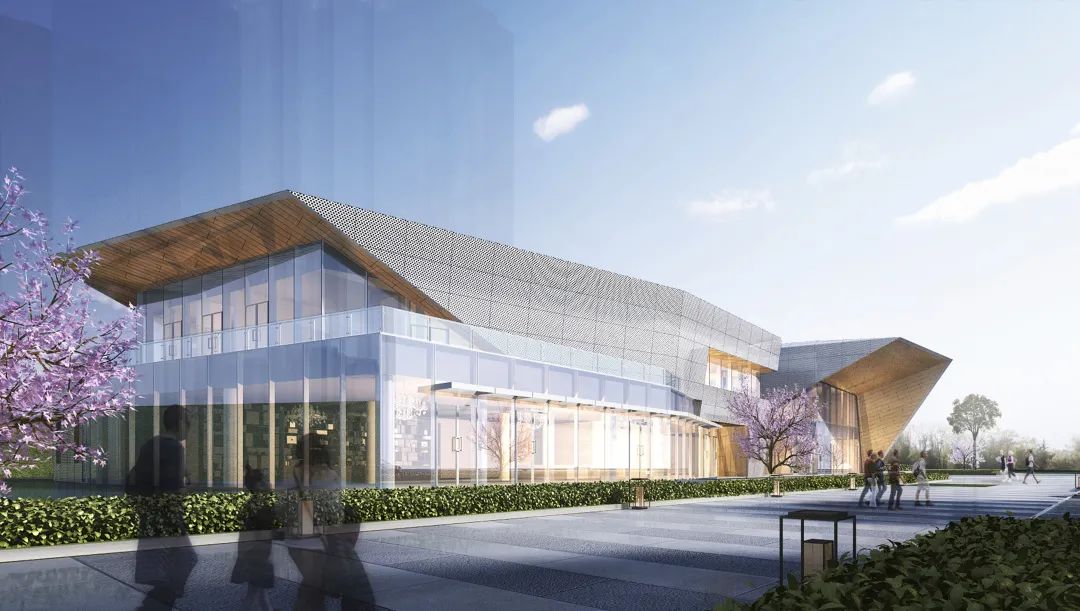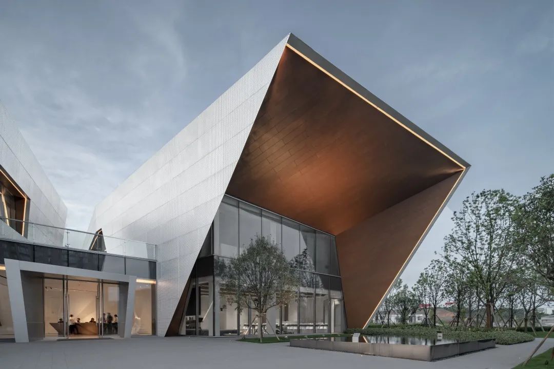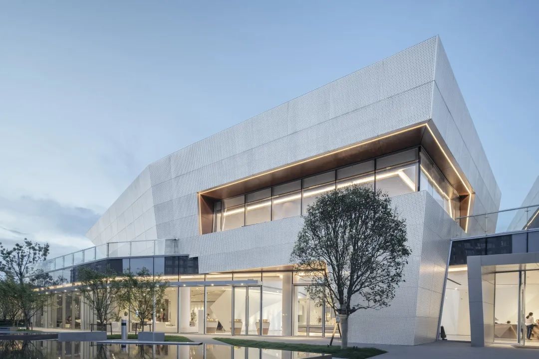 通过对体块的切割,形成前卫现代的建筑形体。大面积穿孔铝板、仿木纹铝板和玻璃体块的结合,使得整体形象极富张力和工业美感。