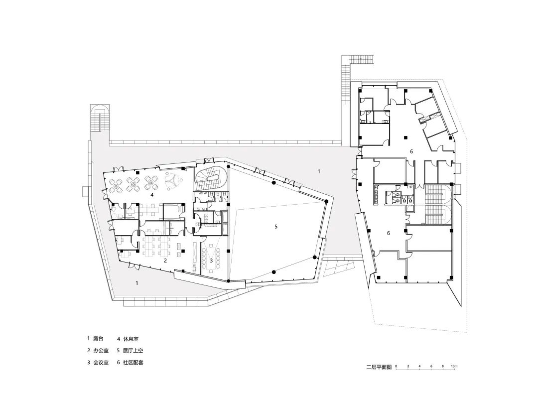 建筑两部分的转角开口,形成了一个梯形的入口广场。由此进入经过门厅,来访者可以顺着几何空间不断向上,参访两层的各个主题展厅。展厅的主题则主要关注于科学和技术相关的内容,并设置了可供年轻游客参与的互动装置,寓教于乐。
