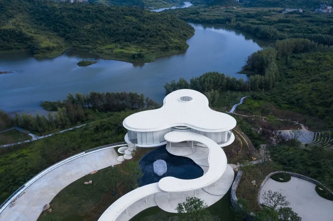 在贵州省清镇市,蜿蜒的老马河畔漂浮着一朵洁白的“云朵”,在葱葱郁郁的绿树中时隐时现。这里是清镇湿地公园里的云朵艺术馆,近观步移景异,高透的弧形玻璃撑住流畅的云朵造型。