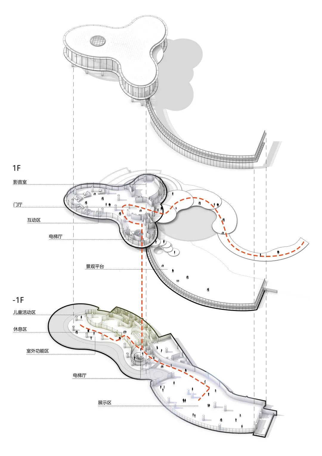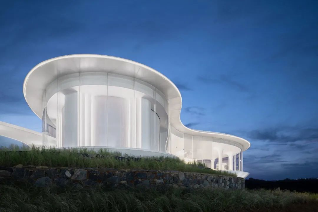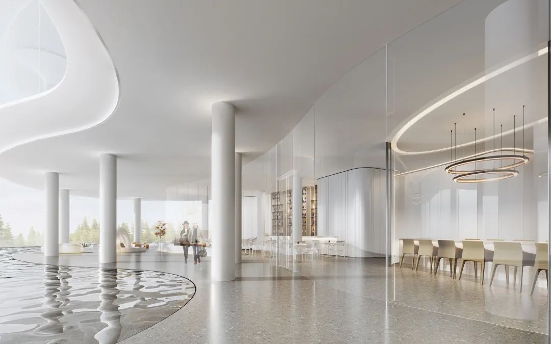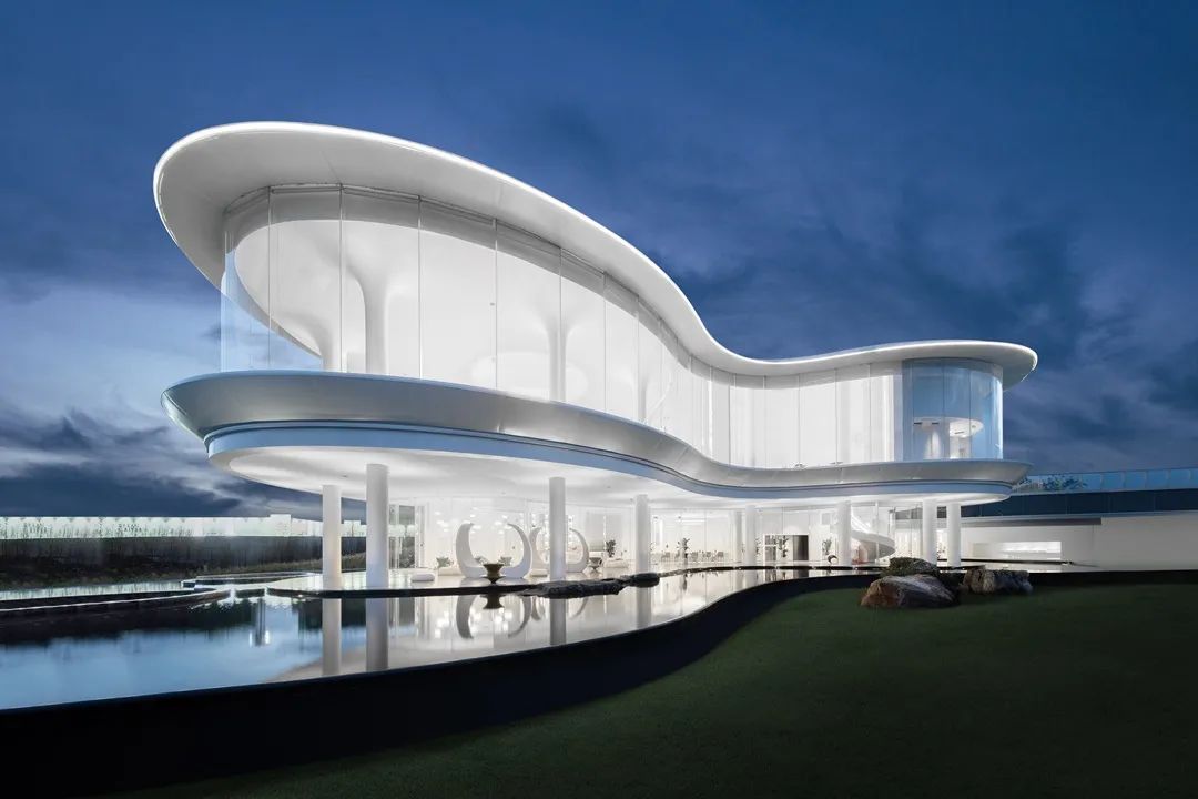 建筑温柔简约的流线造型展现出更宽广的包容性,洁白的云朵完全去除了地标建筑自有的张扬侵略感,创造出与山峦、河流共存的一片云。