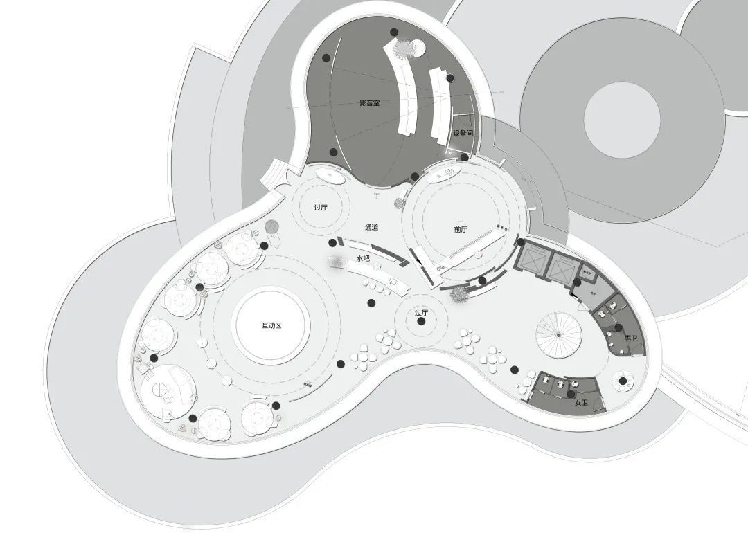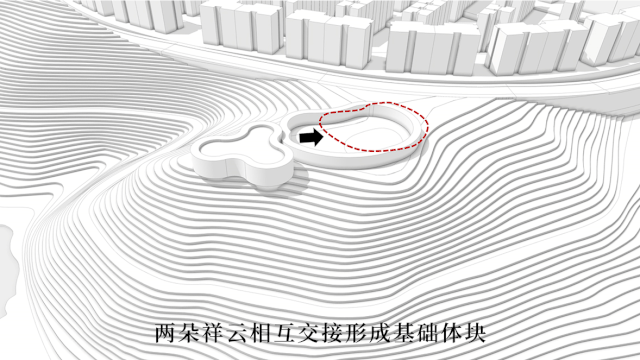 设计取意传统文化中的祥云符号,加以抽象提取,形成独有的云朵造型。流畅的建筑形体加深了和环境的结合度,面向老马河的角度细致推敲,避免周边山头的干扰,尽可能的使得视线穿透树影到达水面。