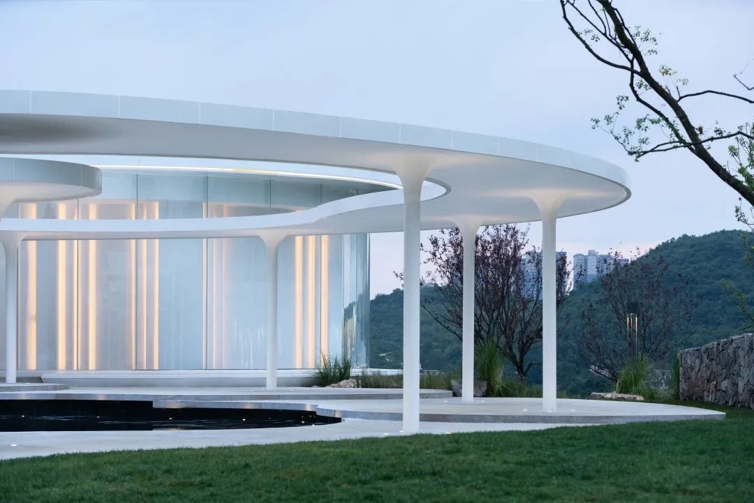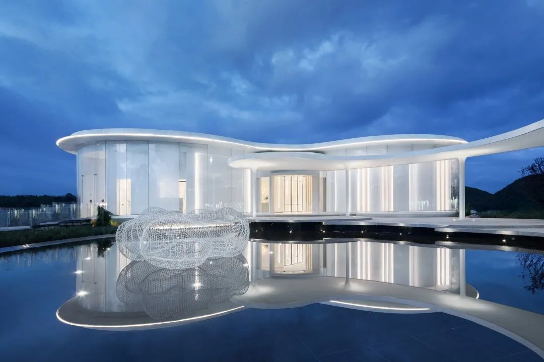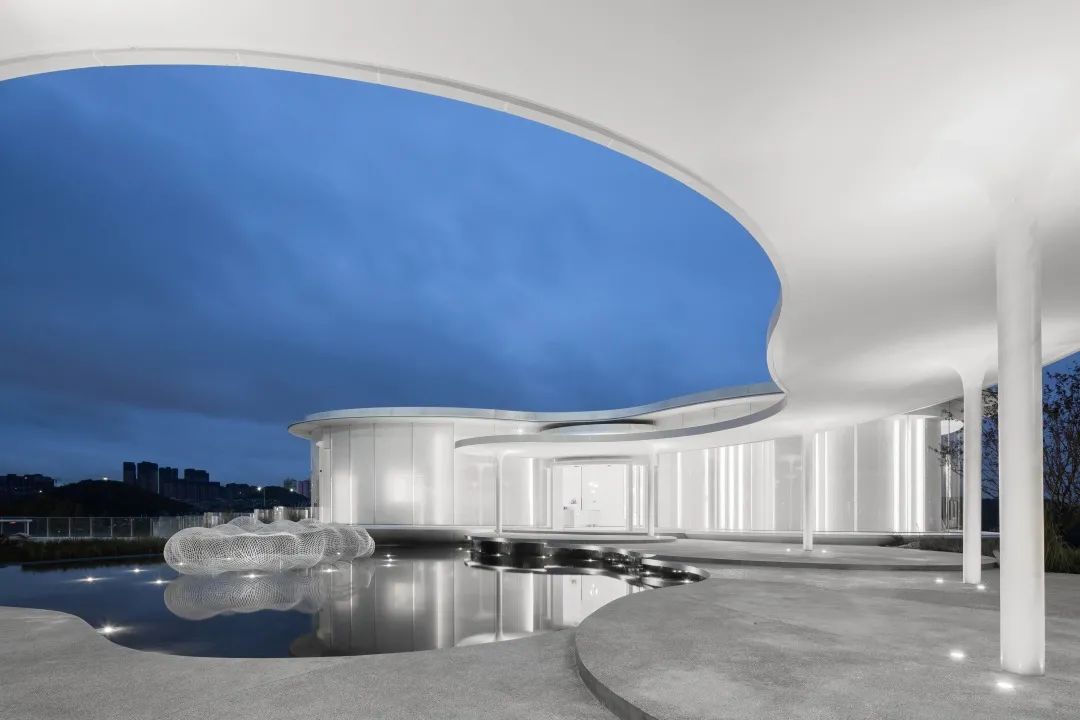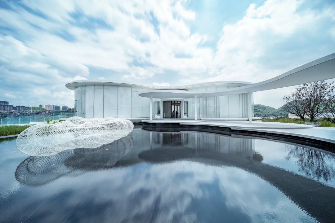 建筑四周完全连续的玻璃面将室外多维度的景观渗透到视野内,使得山、水、景相互交融。整体建筑轻盈通透、色泽柔和,结合内敛的底座空间,更显艺术馆的气质灵动飘逸。