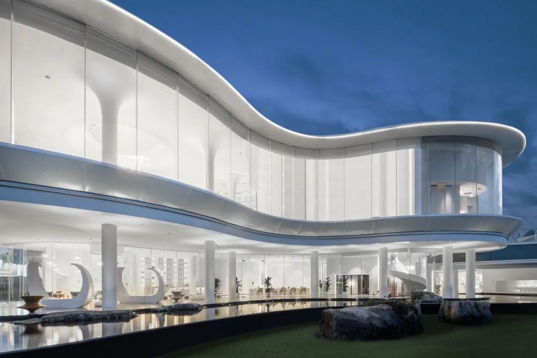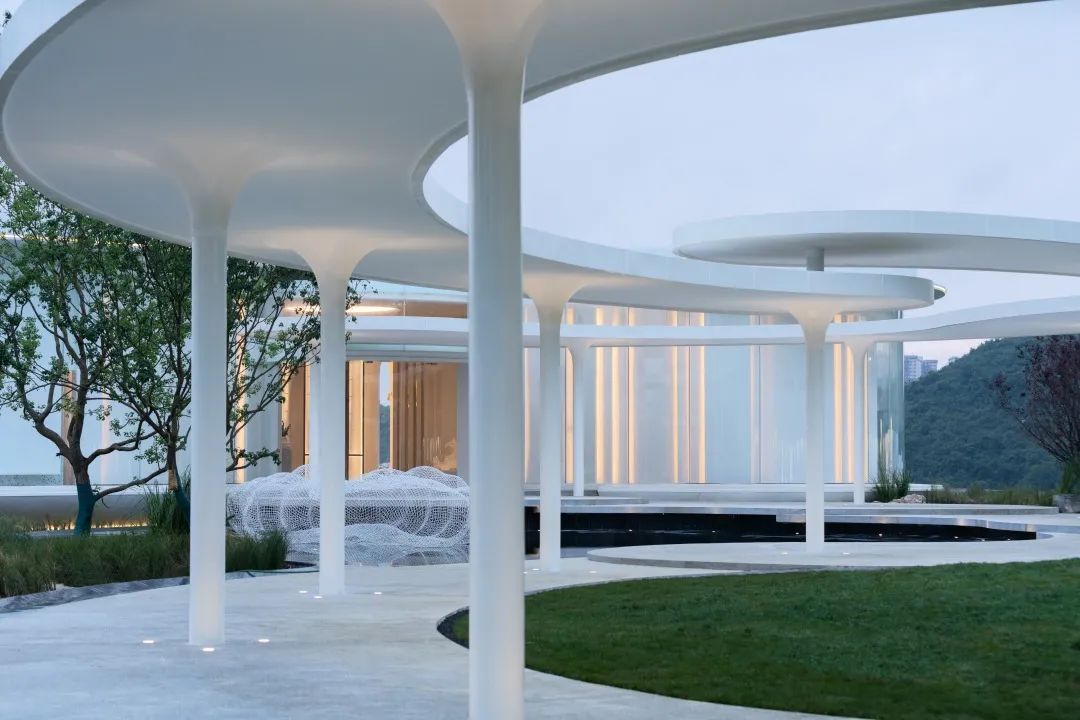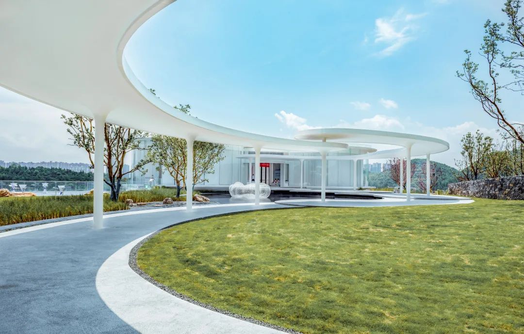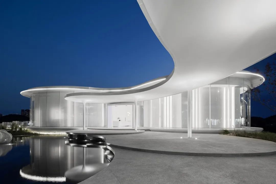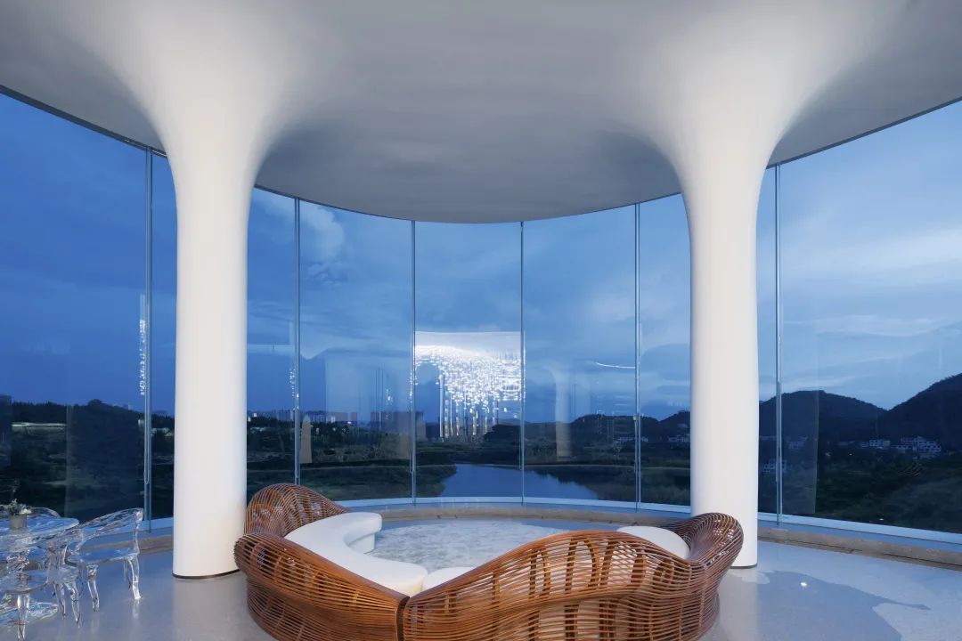 建筑四周完全连续的玻璃面将室外多维度的景观渗透到视野内,使得山、水、景相互交融。整体建筑轻盈通透、色泽柔和,结合内敛的底座空间,更显艺术馆的气质灵动飘逸。