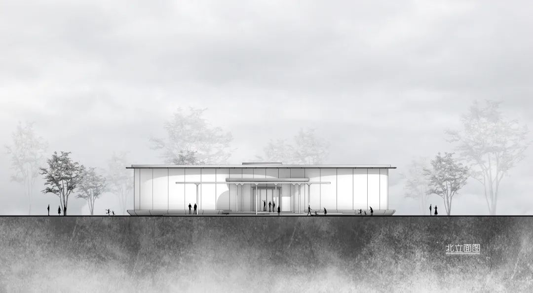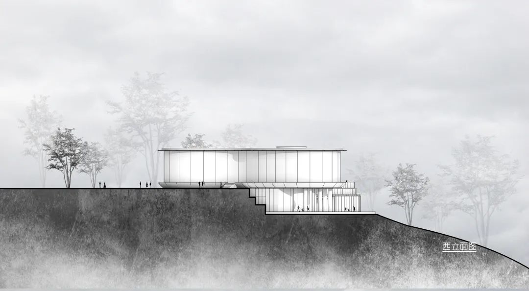 为了不大肆破坏场地原有的环境,将艺术馆分为接待前区和研学营主体两个部分,接待前区采用流线型架空走廊的形式,引导人们在自然山水之间进入研学营,而主体建筑则通过材质的变化轻盈的矗立在山头,从河面往上看,更像那朵在山间的云。