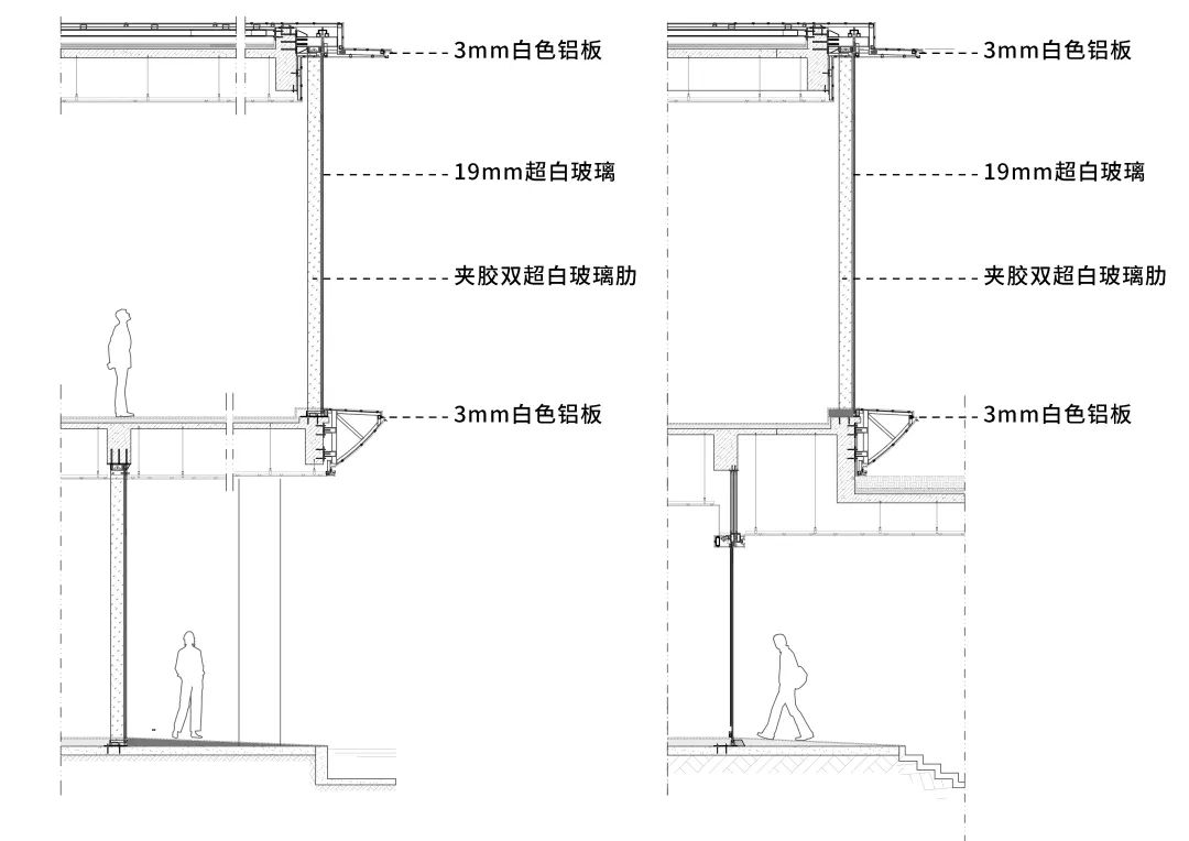 建筑立面通过铝板和玻璃的组合,材质的特性产生强烈的反射与通透的对比,既是各成领域又互相映衬,使得建筑的质感细腻精致。同时,玻璃、水面的镜面反射与铝板的漫反射交汇共生,水面倒影建筑轮廓,玻璃反射树影与天空,形成一幅光影变幻的生动场景。