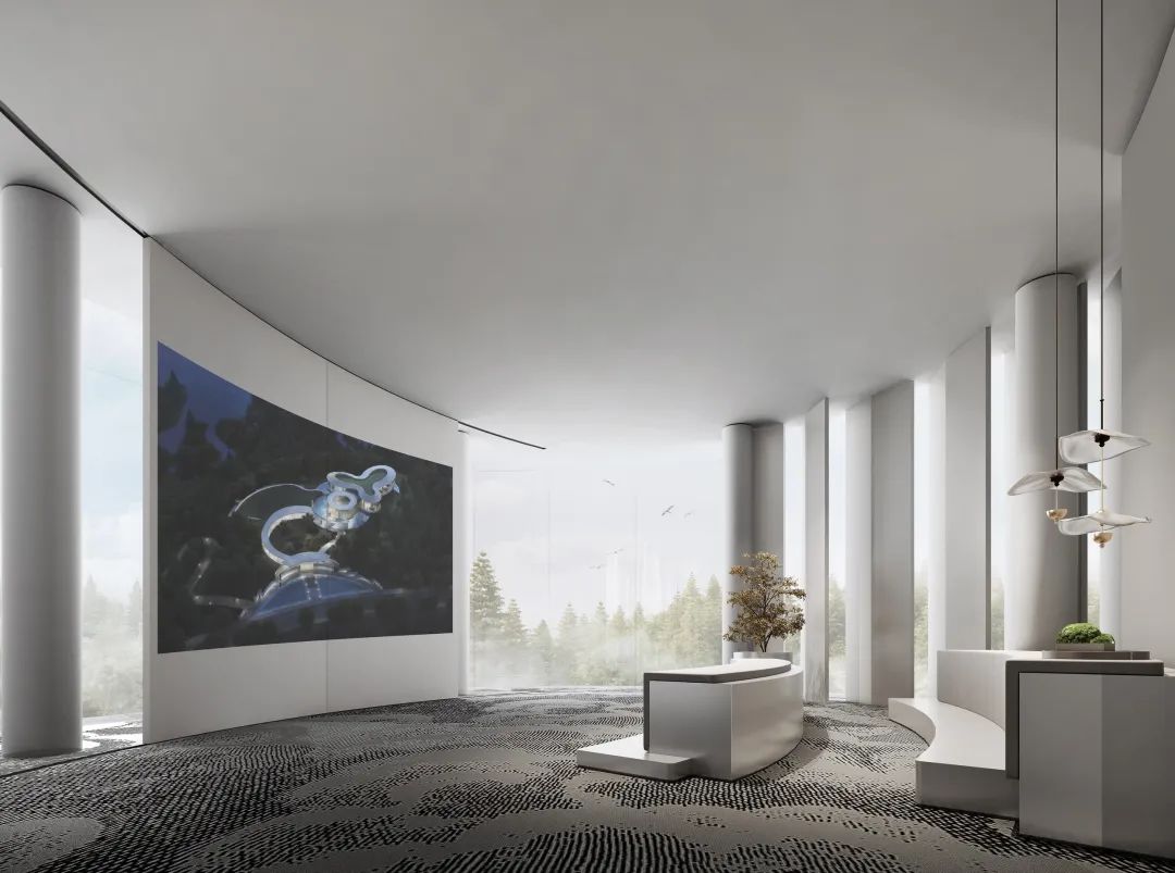 室内空间天地墙均覆以纯白,并以双曲面锥形的圆形支柱进行支撑。曲面空间让建筑室内外更加柔和,并增强双曲线柱顶的视觉效果。