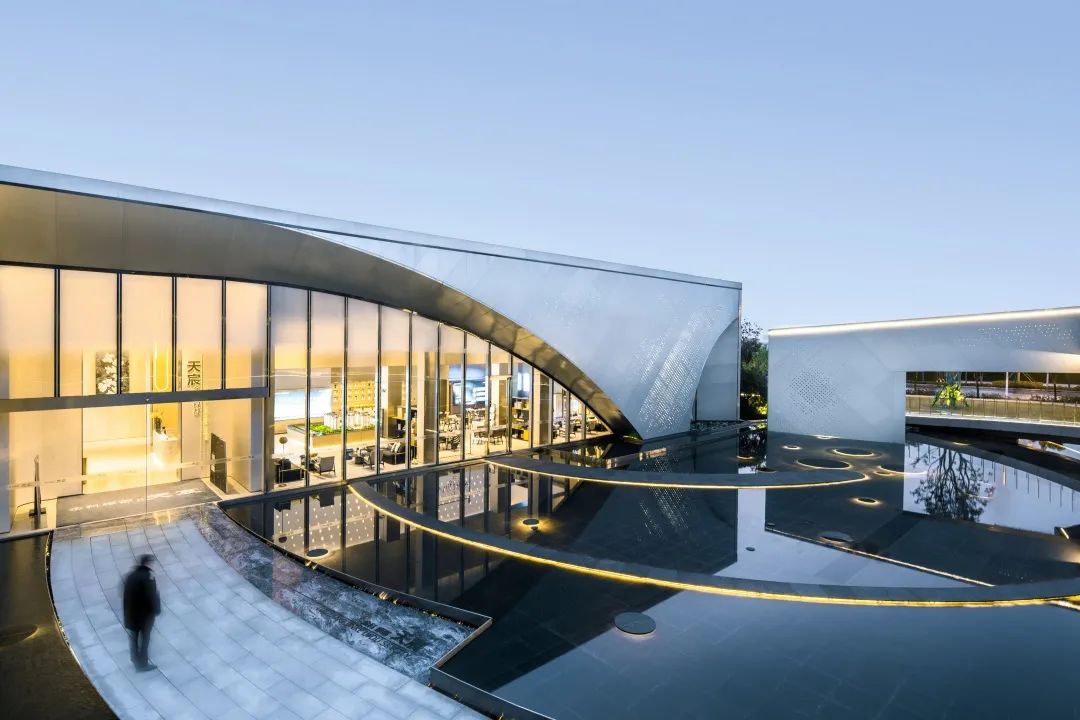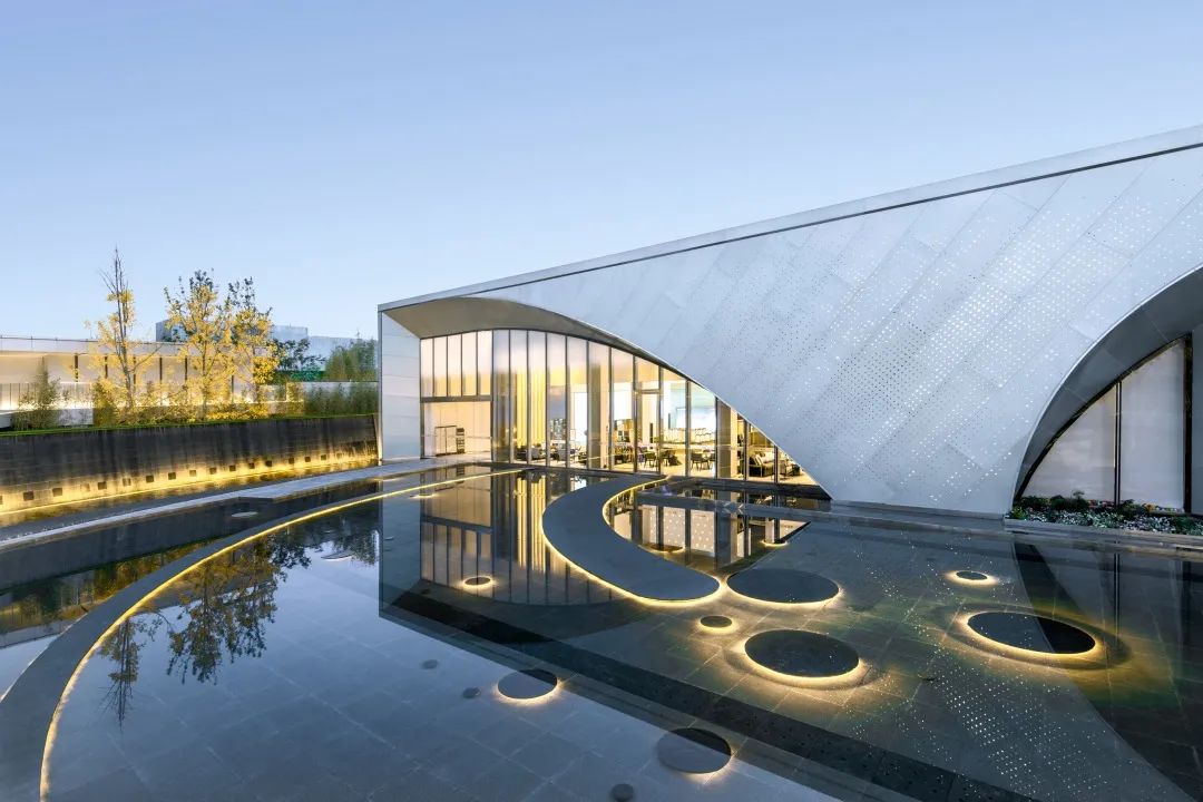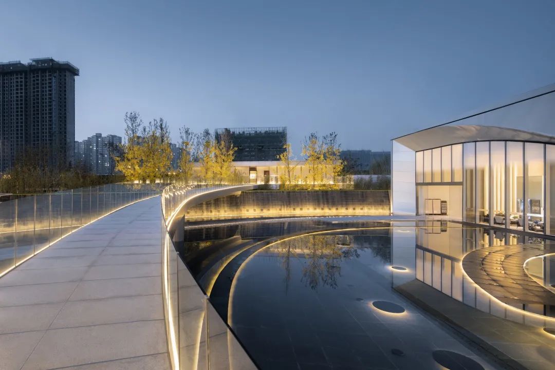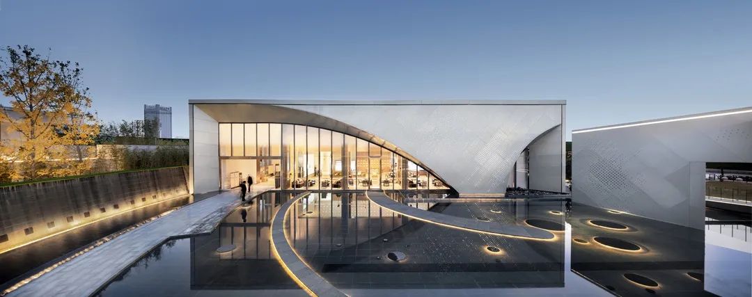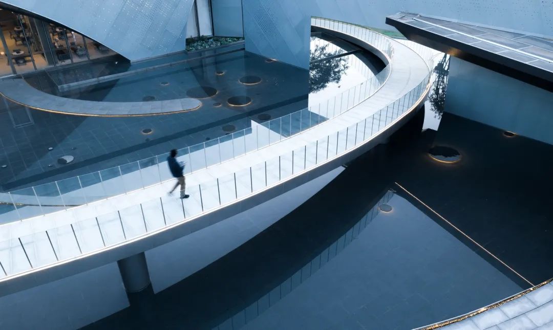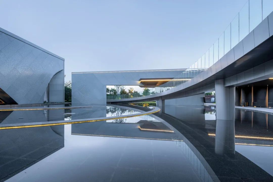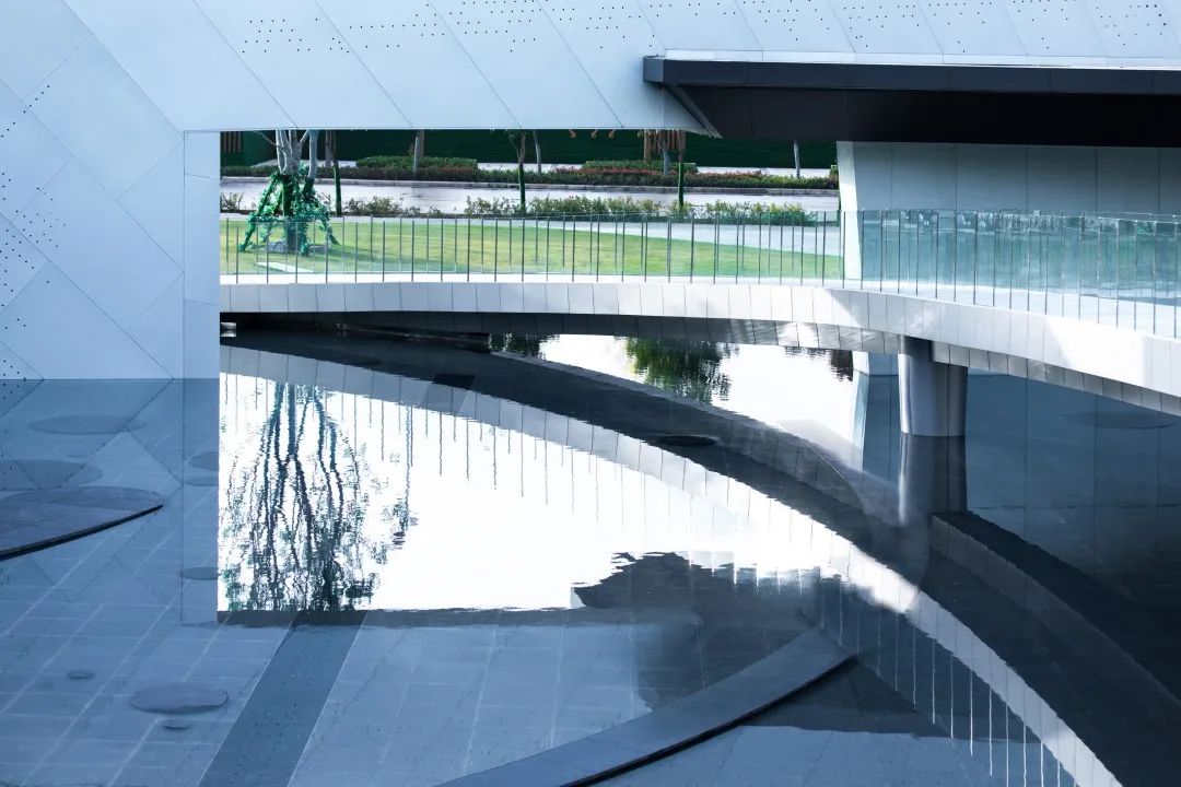 空间与视觉的连续性:立面的墙体通过艺术创作产生视觉上的肌理感,将光与影带入到空间中,微风拂过水波倒影连廊起伏,层层涟漪之上倒映出朦胧的树影与建筑。运用玻璃等半透明材料,舒朗别致的造型结构打破景观与建筑的界限,打造空间与视觉的连续性与纯净性。