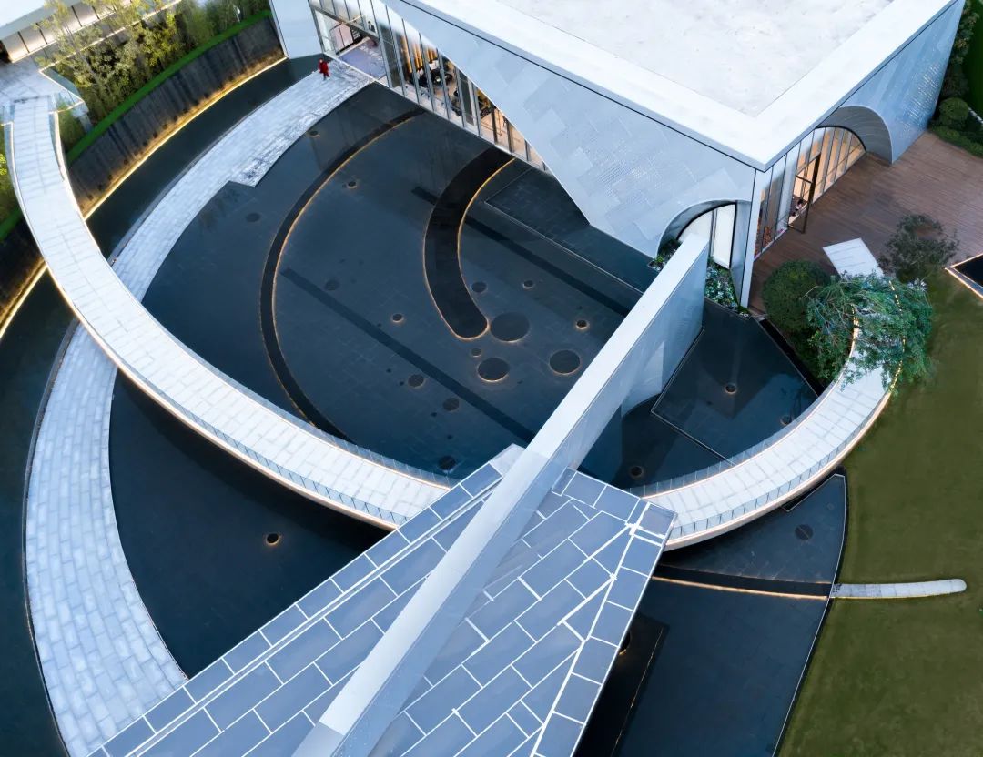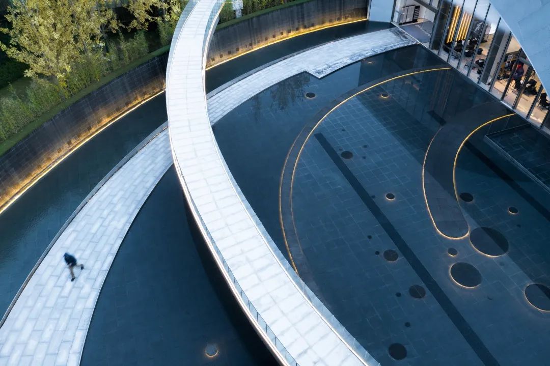 曲线形和方形的空间,与景观的廊桥相互回应。建筑立面的曲线与景观廊桥的曲线延续统一,这是一条隐性的认知流线——向上、向内、向光,悬隔日常,划过银河,回归自我。