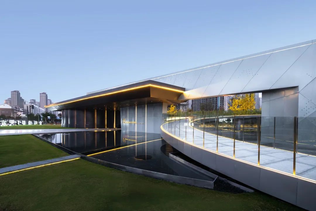 本项目突破常规售楼处几进院落的关系,将建筑本身与前后场景观最大化的利用起来,让整个示范区浑然天成大气生动,更让参观者在参观过程中,从不同角度,每时每刻感受到建筑景观一体化的美妙魅力,创造出一种漫步浩瀚宇宙的大境界。