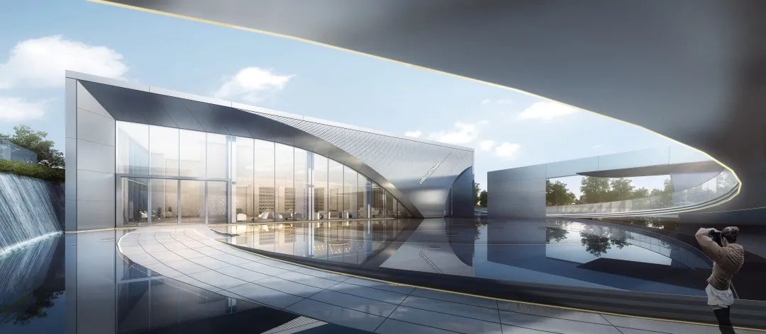 独特的示范区入口门头设计,三角形交错切割搭的顶盖搭配弧与圆变形拼接的墙体,选用与建筑表面相同的铝板材质,让每一个到访的客户都能体会到尊贵大气的仪式感。大门整体框架为线条设计感十足的多边几何形,肆意张扬的角,似无限延伸的线,百变的面富有动感。“迎”、“聚”、“观”一气呵成。整体为黑白色调,纯粹简约,同样不缺少高级质感。从内延伸至外的水面,倒映着蓝天白云,似天地颠倒闯入一片幻境,似梦而非梦。