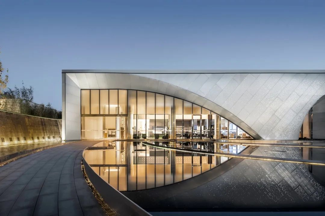 本项目突破常规售楼处几进院落的关系,将建筑本身与前后场景观最大化的利用起来,让整个示范区浑然天成大气生动,更让参观者在参观过程中,从不同角度,每时每刻感受到建筑景观一体化的美妙魅力,创造出一种漫步浩瀚宇宙的大境界。