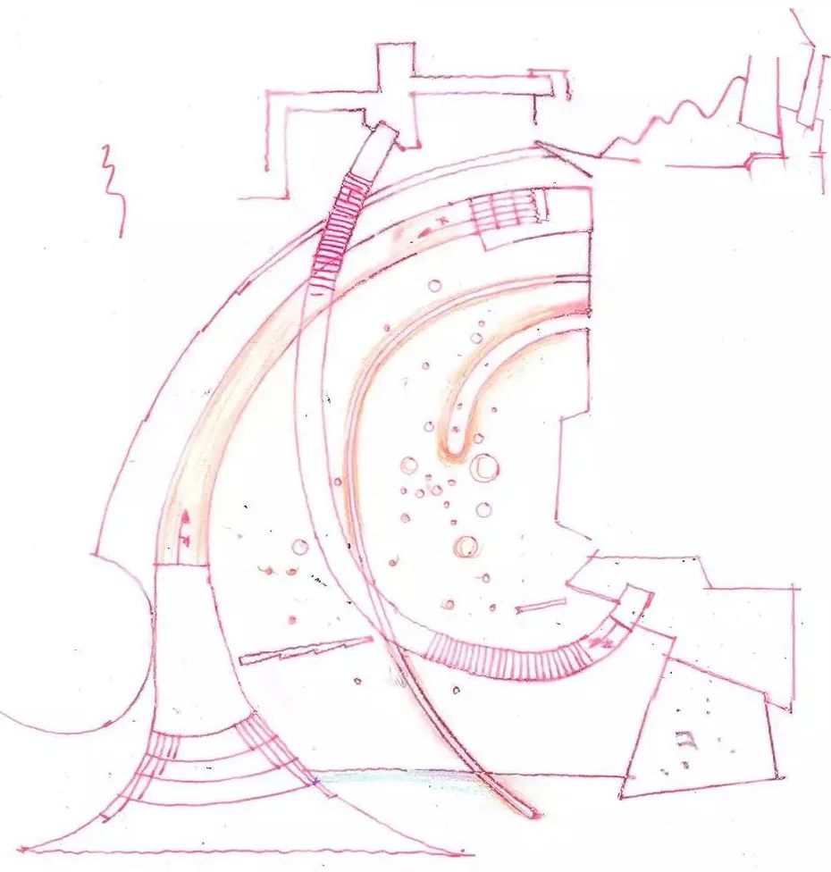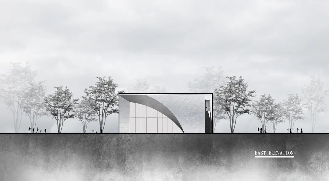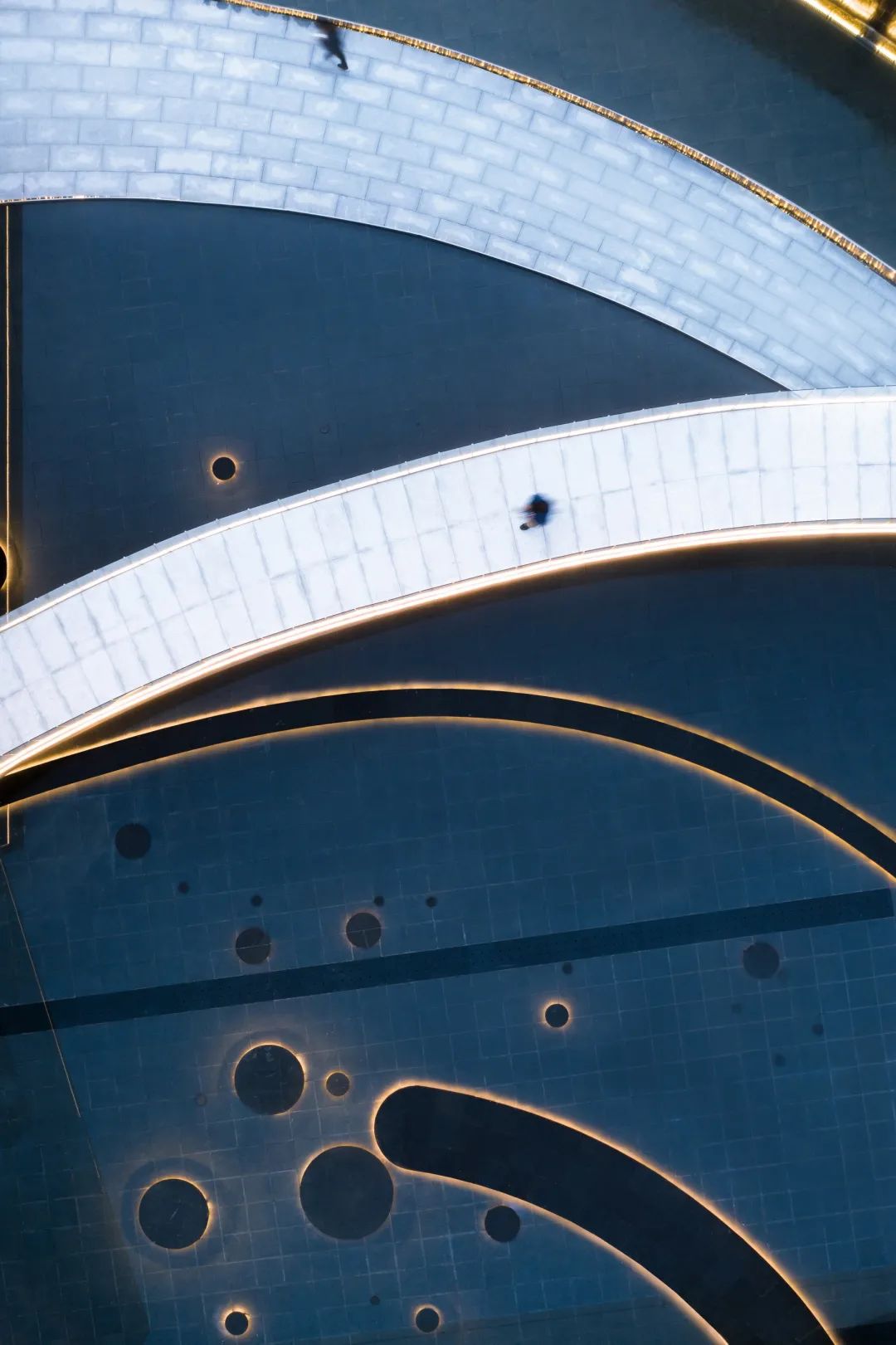 曲线形和方形的空间,与景观的廊桥相互回应。建筑立面的曲线与景观廊桥的曲线延续统一,这是一条隐性的认知流线——向上、向内、向光,悬隔日常,划过银河,回归自我。