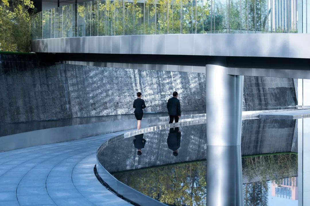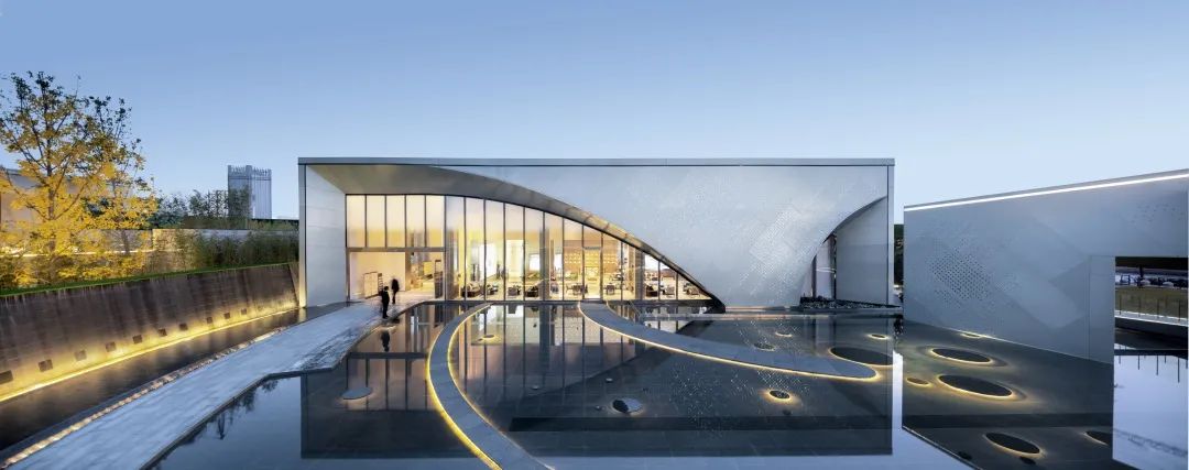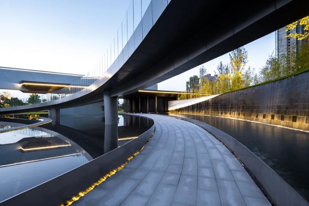 空间与视觉的连续性:立面的墙体通过艺术创作产生视觉上的肌理感,将光与影带入到空间中,微风拂过水波倒影连廊起伏,层层涟漪之上倒映出朦胧的树影与建筑。运用玻璃等半透明材料,舒朗别致的造型结构打破景观与建筑的界限,打造空间与视觉的连续性与纯净性。
