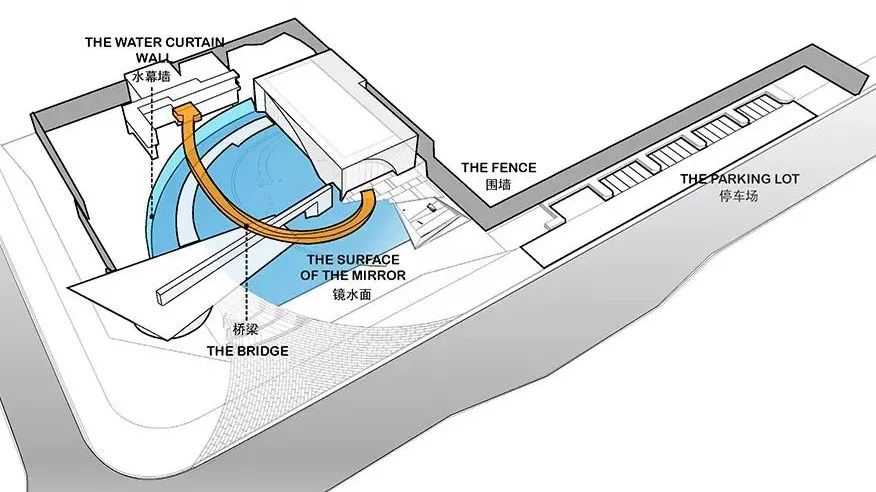 进入场地后的主要观赏空间是眼前的大面积镜面水景,水景往往给人无限延伸的神秘感和想象力。通过水景人们可以看到周围的每时每刻变化,她如同媒介,搭起了人与自然沟通的桥梁。