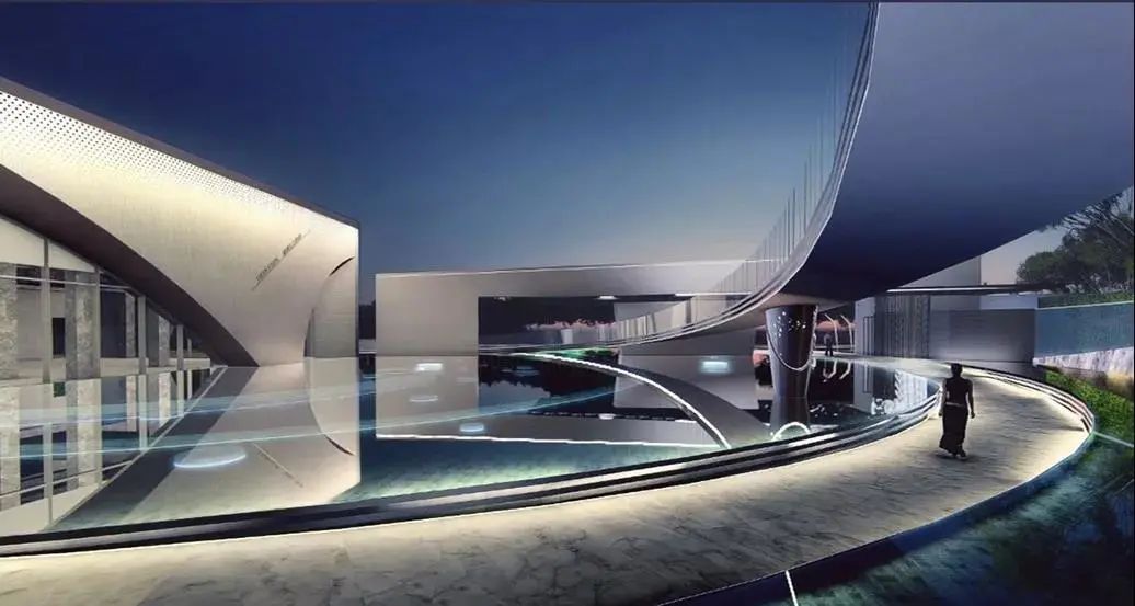 在示范区中构建一座飞桥,两侧桥板采用半透明玻璃材质,整体形态以平滑曲线的设计方式连接售楼处和样板房,增加了整个空间的层次感,在视觉上丰富客户游览体验感。漫步在飞桥之上,可以感受到自己是整个空间的主角,你就是别人眼中最美的风景;行走在桥下,桥与一侧的水幕墙结合,可以感受到一种空灵缥缈的意境。