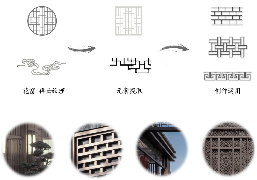 巧妙地在或高或低的围墙、建筑实墙面上配以镂空的格栅,增加了通透感,丰富了立面效果,起到了美化装饰作用。