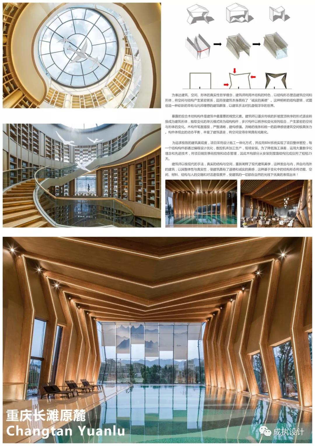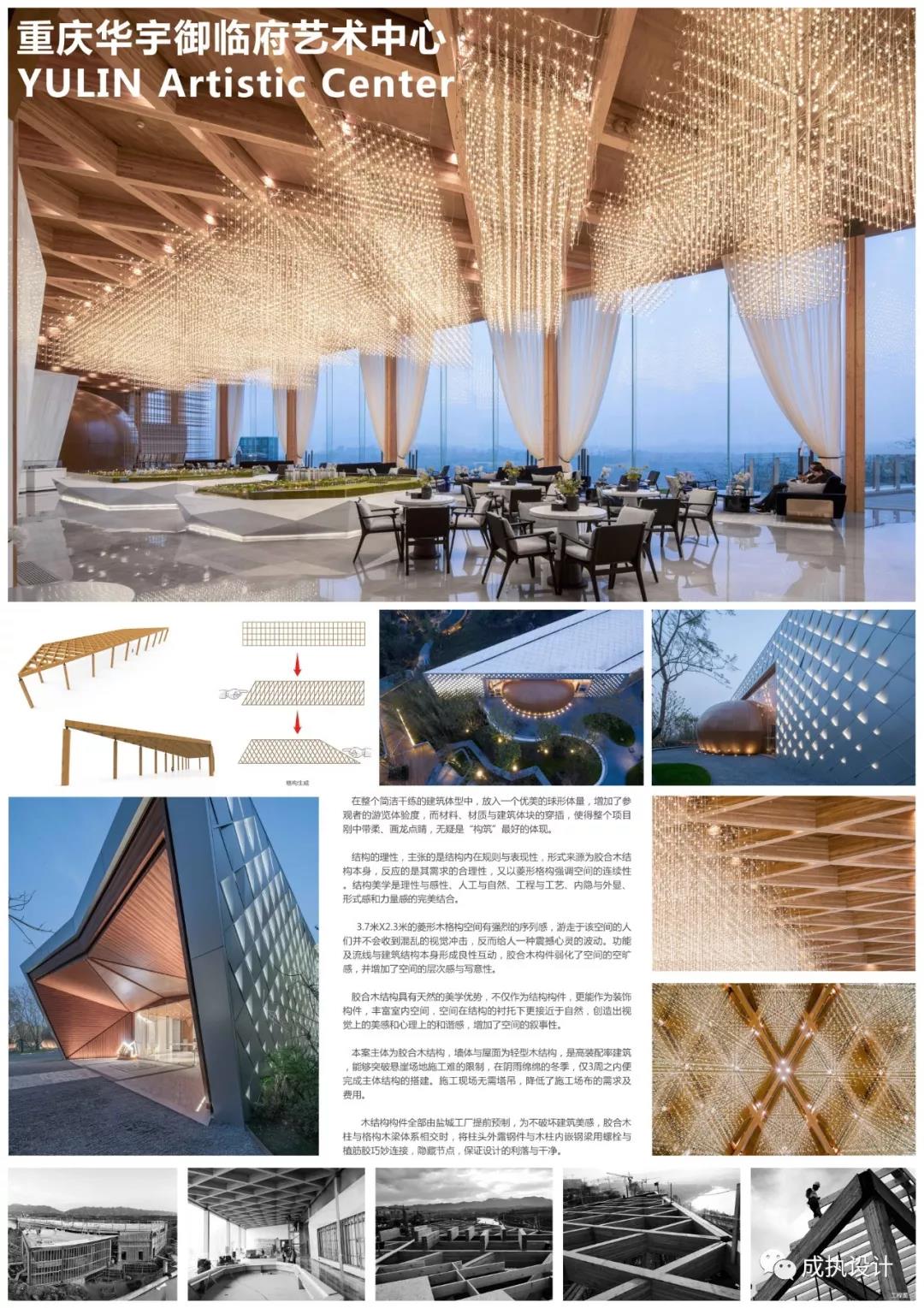 本案位于重庆龙兴悬崖之巅,远眺御临,极简设计,顺应地形。设计上追求内部功能的理性清晰明确的逻辑思考,把内部的事物规则体现在外在形式上。结构的理性,主张的是结构内在规则与表现性,形式来源为胶合木结构本身,反应的是其需求的合理性,又以菱形格构强调空间的连续性。结构美学是理性与感性、人工与自然、工程与工艺、内隐与外显、形式感和力量感的完美结合。